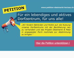 Das Projekt «Obstmarkt & Platz» hat am 9. Juni 2024 ganz knapp keine Mehrheit gefunden. Ein Komitee setzt sich nun dafür ein, dass die umfangreichen Vorarbeiten weiter genutzt werden können und unter Mitwirkung aller Interessierten ein angepasstes Projekt erarbeitet wird. Die Stiftung Dorfbild Herisau unterstützt die entsprechende Petition.
